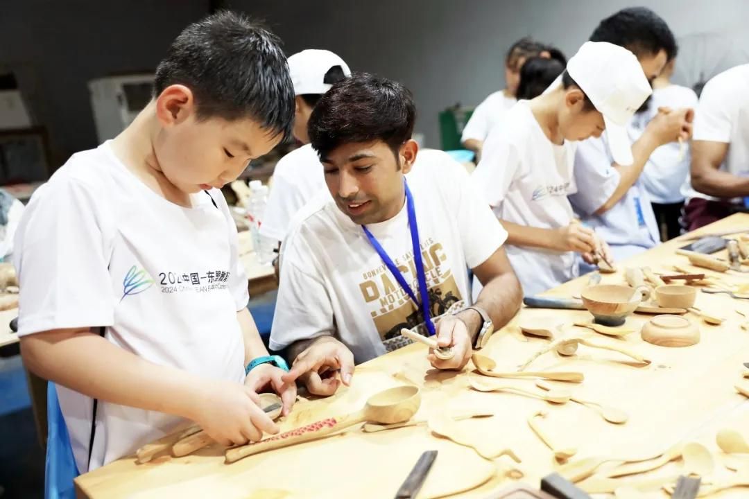 在我校的校园内,小朋友们与国际学生、志愿者们一起参观了校史馆,了解学校的发展概况,切实感受大学氛围;在美术楼的全省非遗传承人群技艺培训基地,聆听了授课教师现场讲解木雕所用木材知识,以及每件作品背后的文化故事后,一起使用雕刻工具,亲身体验木雕技艺的魅力,近距离感受中华文化的独特魅力;在体育馆,现场观看了学校舞龙队与国际学生共同的舞龙舞狮表演,体验学习舞龙舞狮表演中涉及的各种动作和手势及舞龙舞狮的历史文化背景,通过模仿和练习,逐渐掌握了舞龙舞狮的技巧,伴随着欢快的鼓点,沉浸式感受我国传统非遗民俗魅力。