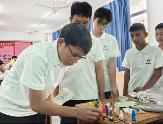 在非遗文化体验环节,宣讲志愿者首先通过图文与实物展示,介绍了彝族服饰的纹样寓意、火把节的起源等知识。随后,孩子们在志愿者指导下体验漆扇制作:调漆、绘纹、晕染,一把把素色纸扇在孩子们手中逐渐绽放出绚烂的色彩。